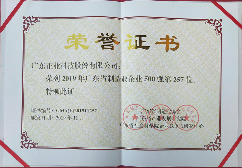 正業(yè)科技榮列“2019年廣東制造業(yè)企業(yè)500強”榜單,這充分彰顯了公司在制造領(lǐng)域深耕細作,所表現(xiàn)出來的卓越綜合實力和強大市場競爭力。