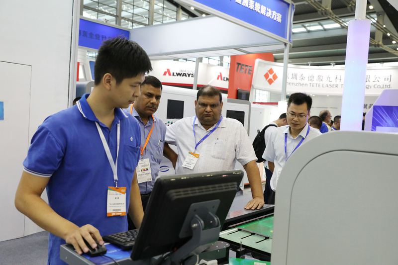 ▲技術(shù)人員為客戶講解PCB全自動二維碼激光打標機