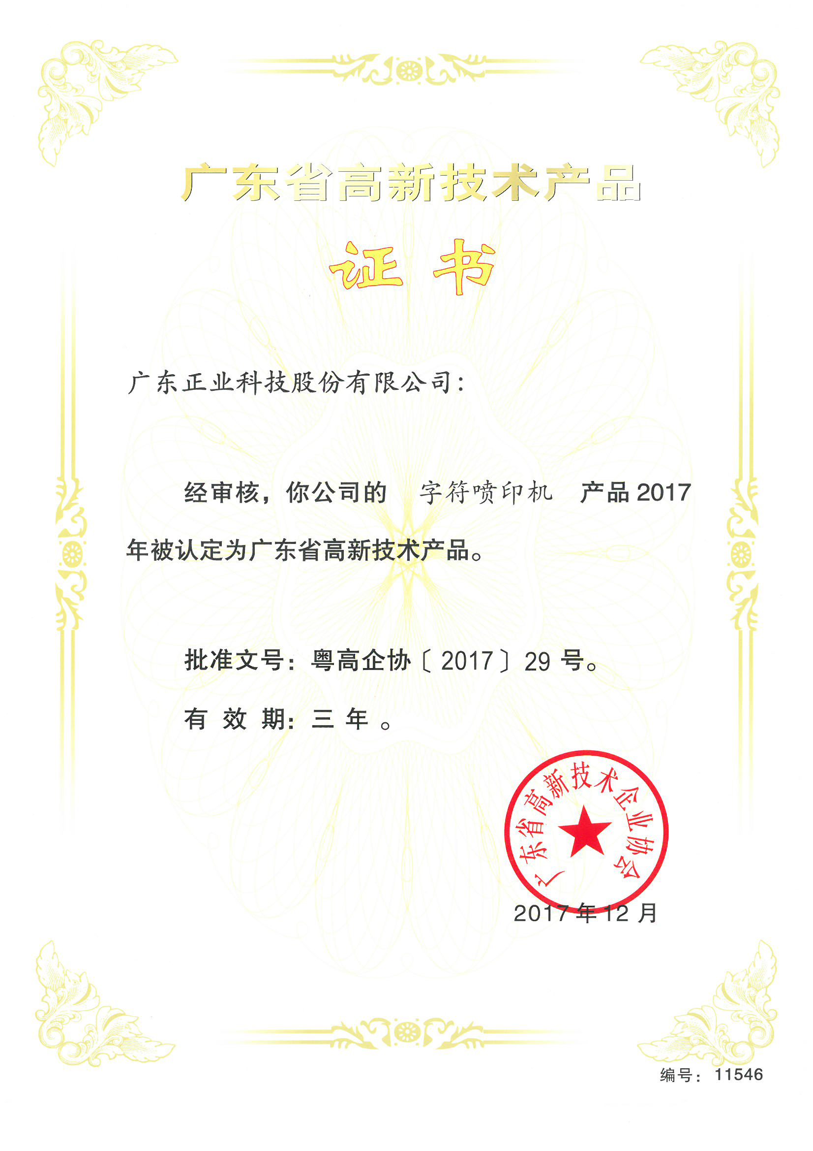 正業科技字符噴印機榮獲廣東省高新技術產品認證